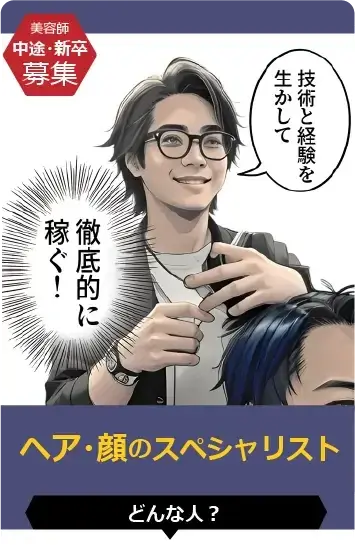 私たちは、美容専門学校を出たばかりの方や、サロン未経験の異業種出身者(10 年のブランクがある方も含めて)でも一人前に育てるカリキュラムと環境を用意しています。